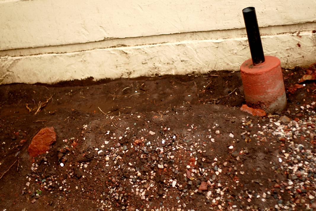To the right of the main entrance of the hotel, there are six body-sized mounds