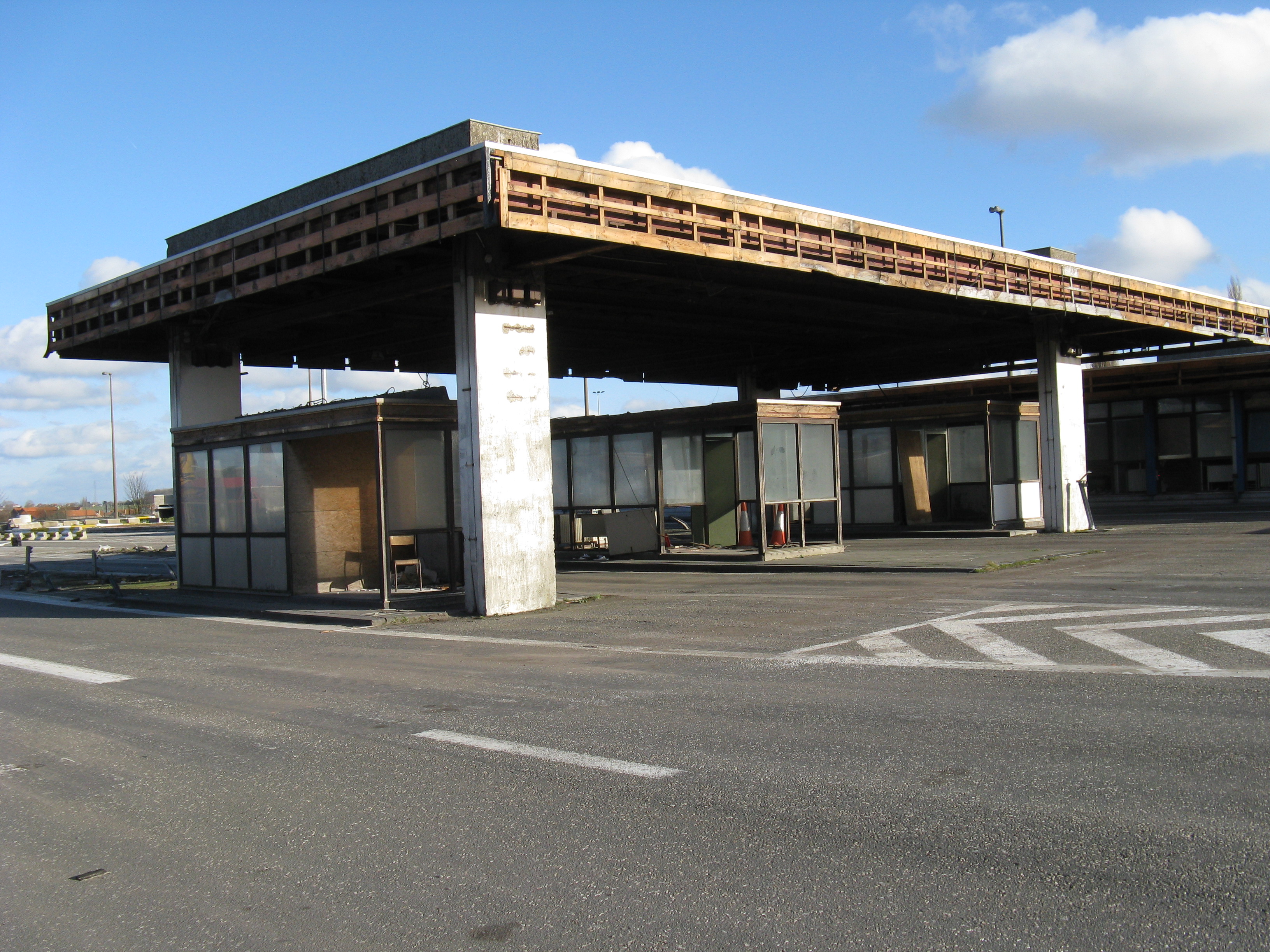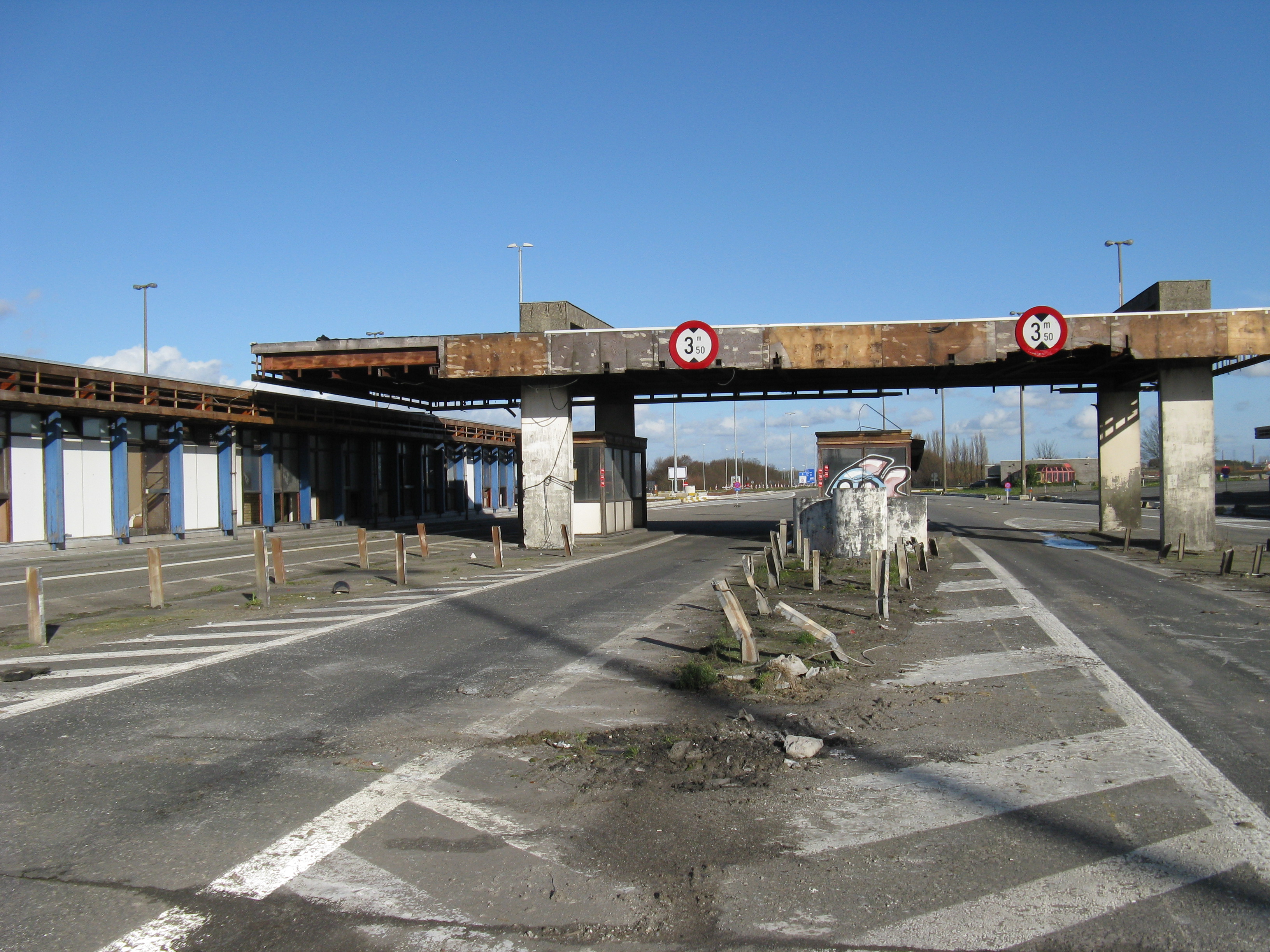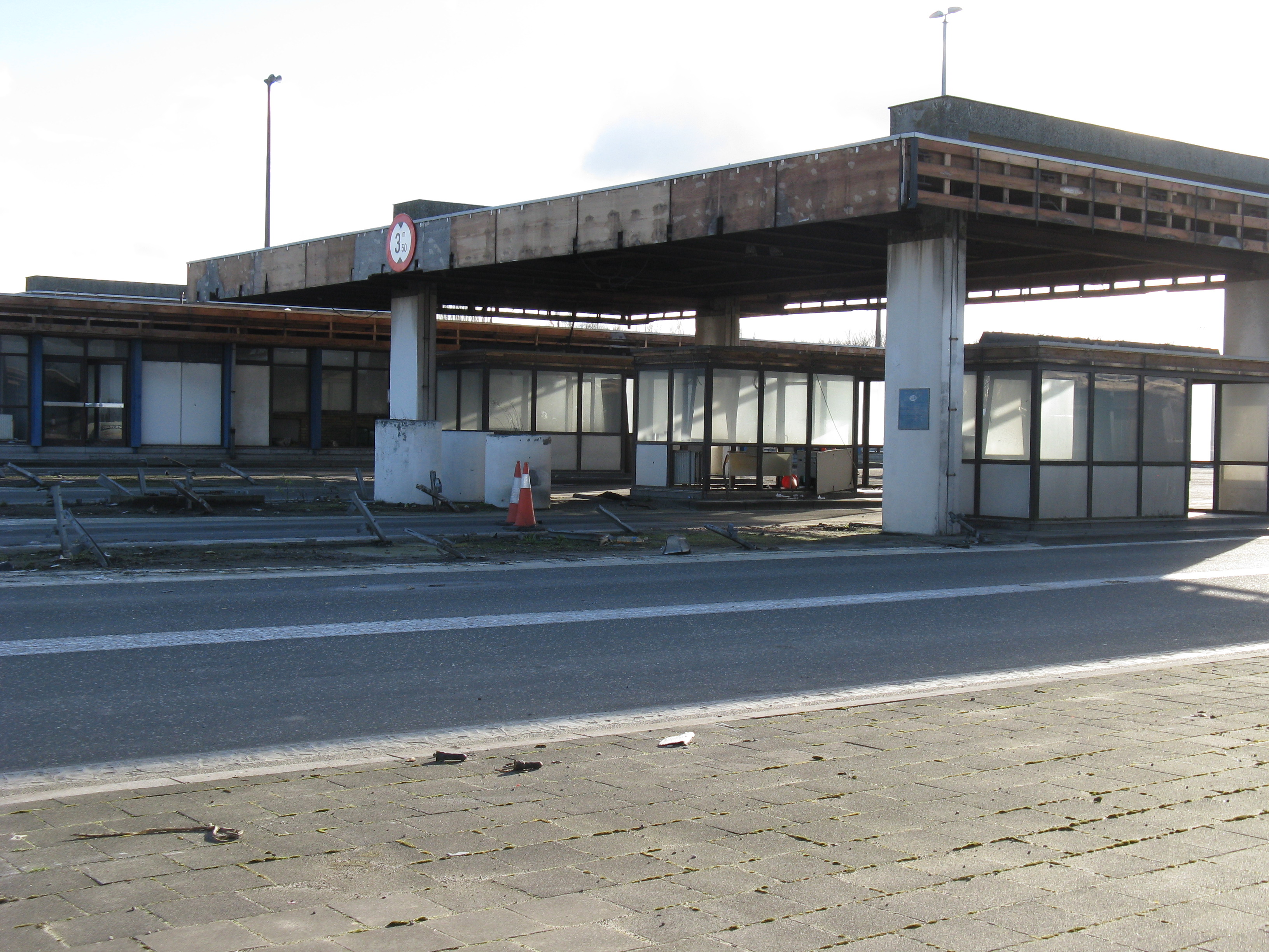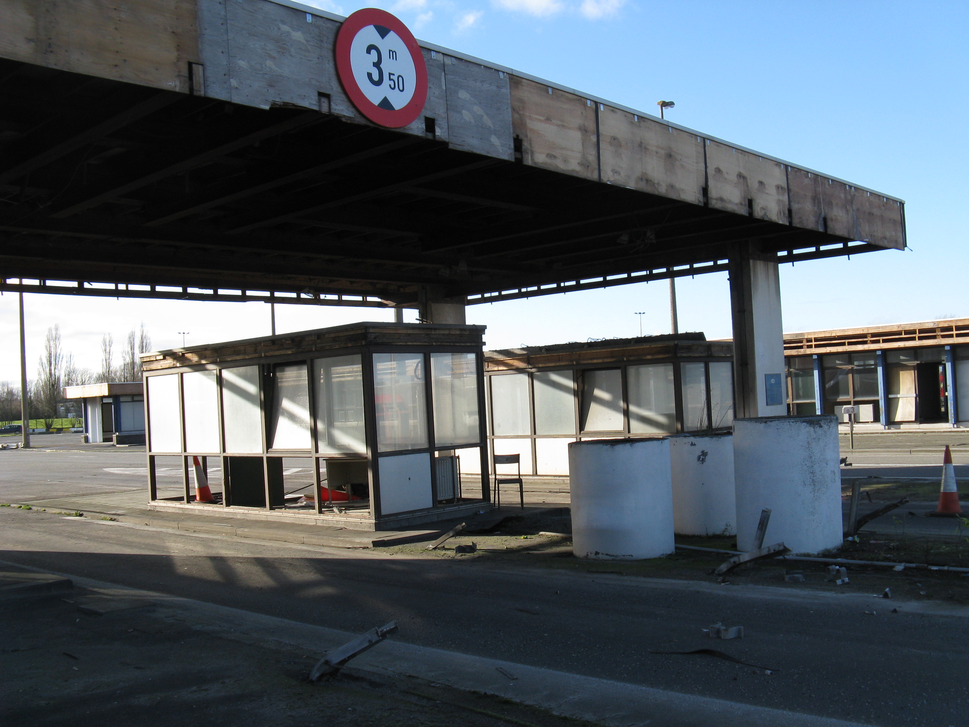 "Following the gradual implementation after 1995 of the Schengen Agreement throughout most of the European Union, systematic border checks and patrols disappeared to allow for the free movement of people between different countries. As a consequence, most border posts were quickly removed. This example is at Rekkem, about 10 miles north of the French city of Lille on the main route from Paris to northern Europe and is located precisely on the France / Belgium border (although technically, the buildings are on Belgian soil). In its day, it was reportedly the largest example of its kind in Europe and had a variety of services for both staff and travellers—including a couple of cells. After lying abandoned for over twenty years, work finally began in February 2014 to destroy it within a month. Spot checks by Customs can still take place however, as on the day the pictures were taken."