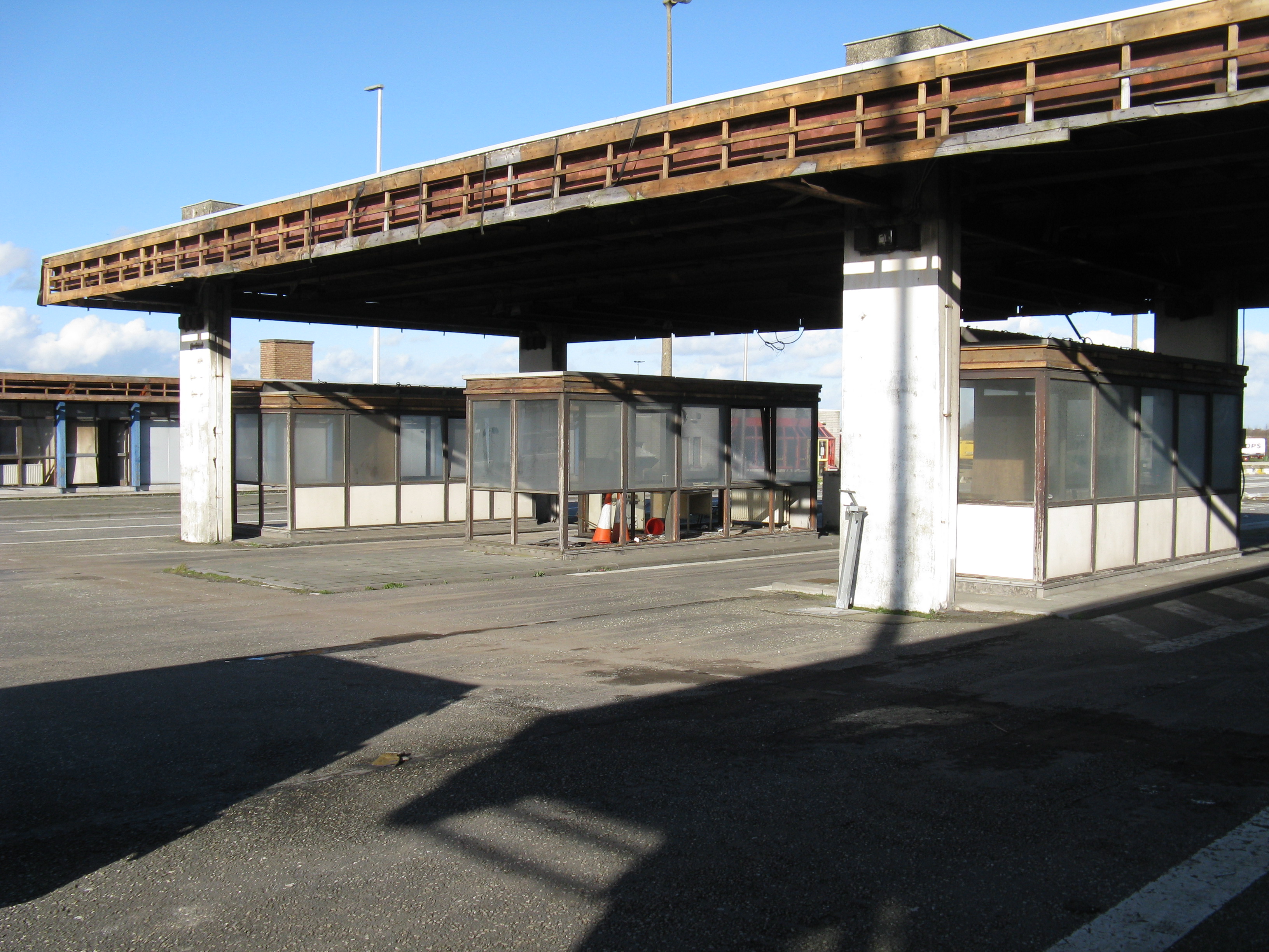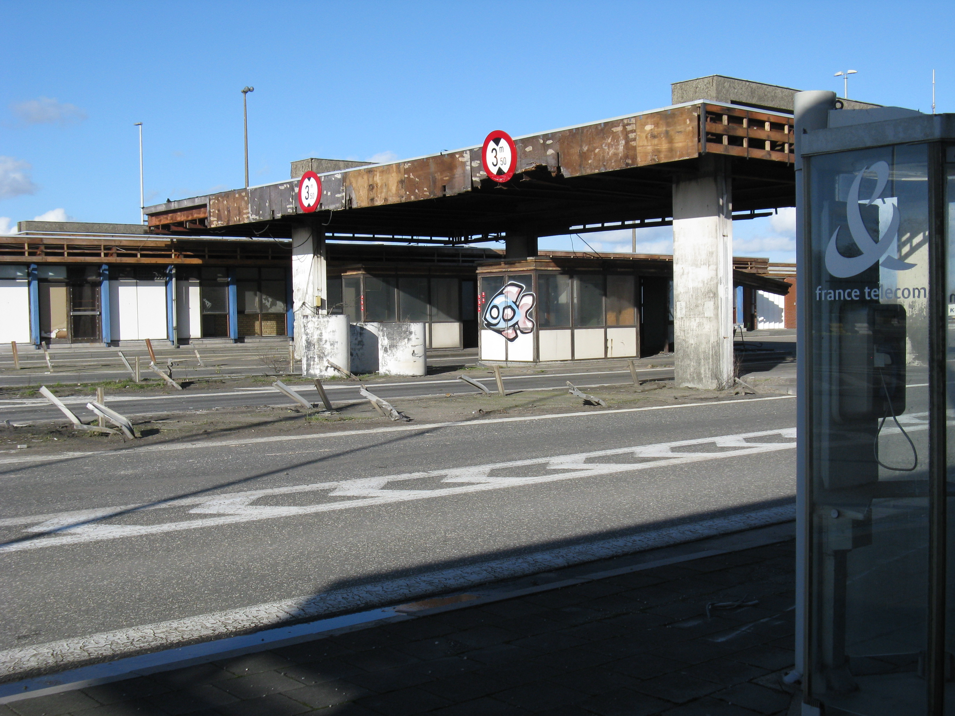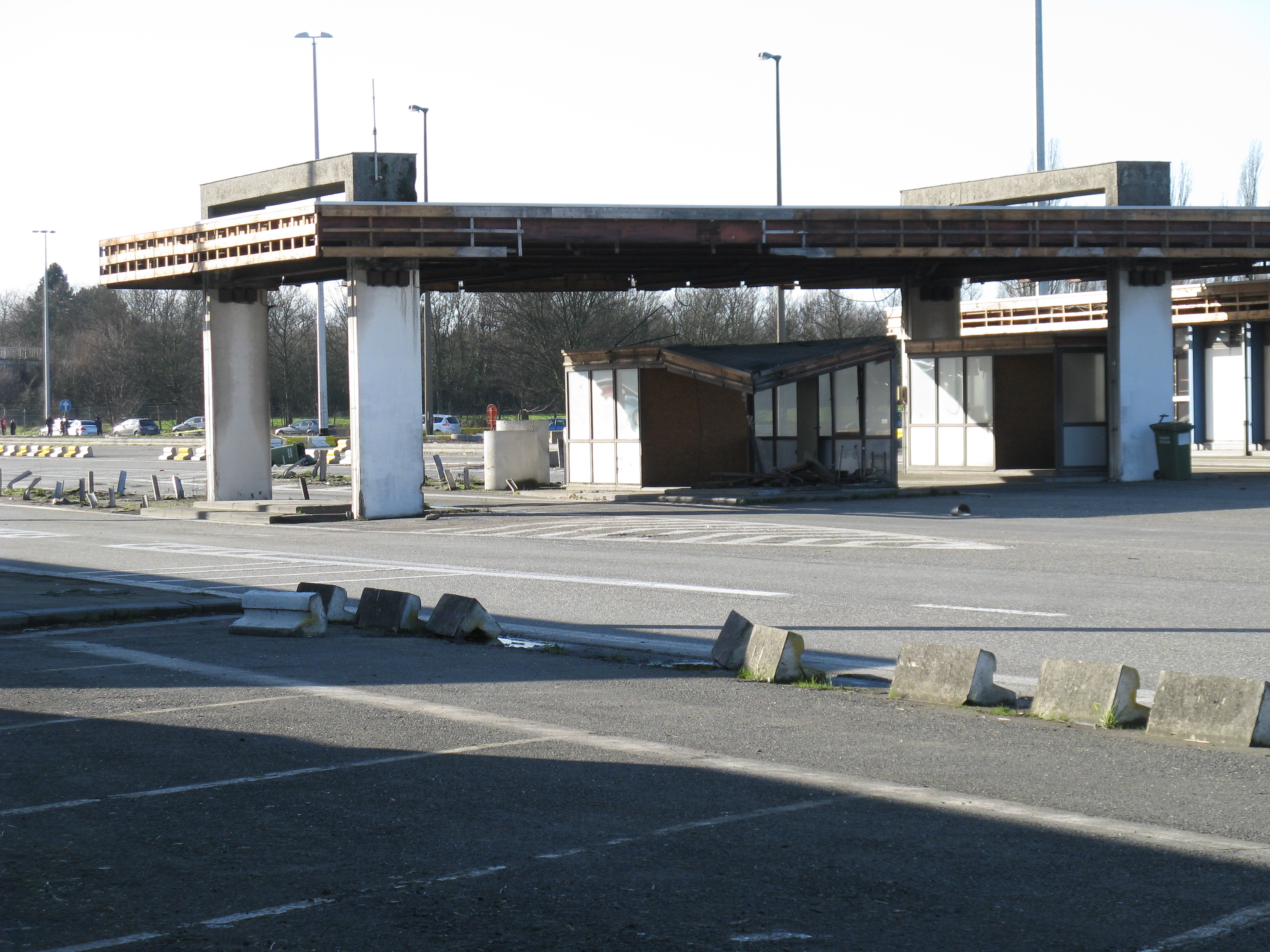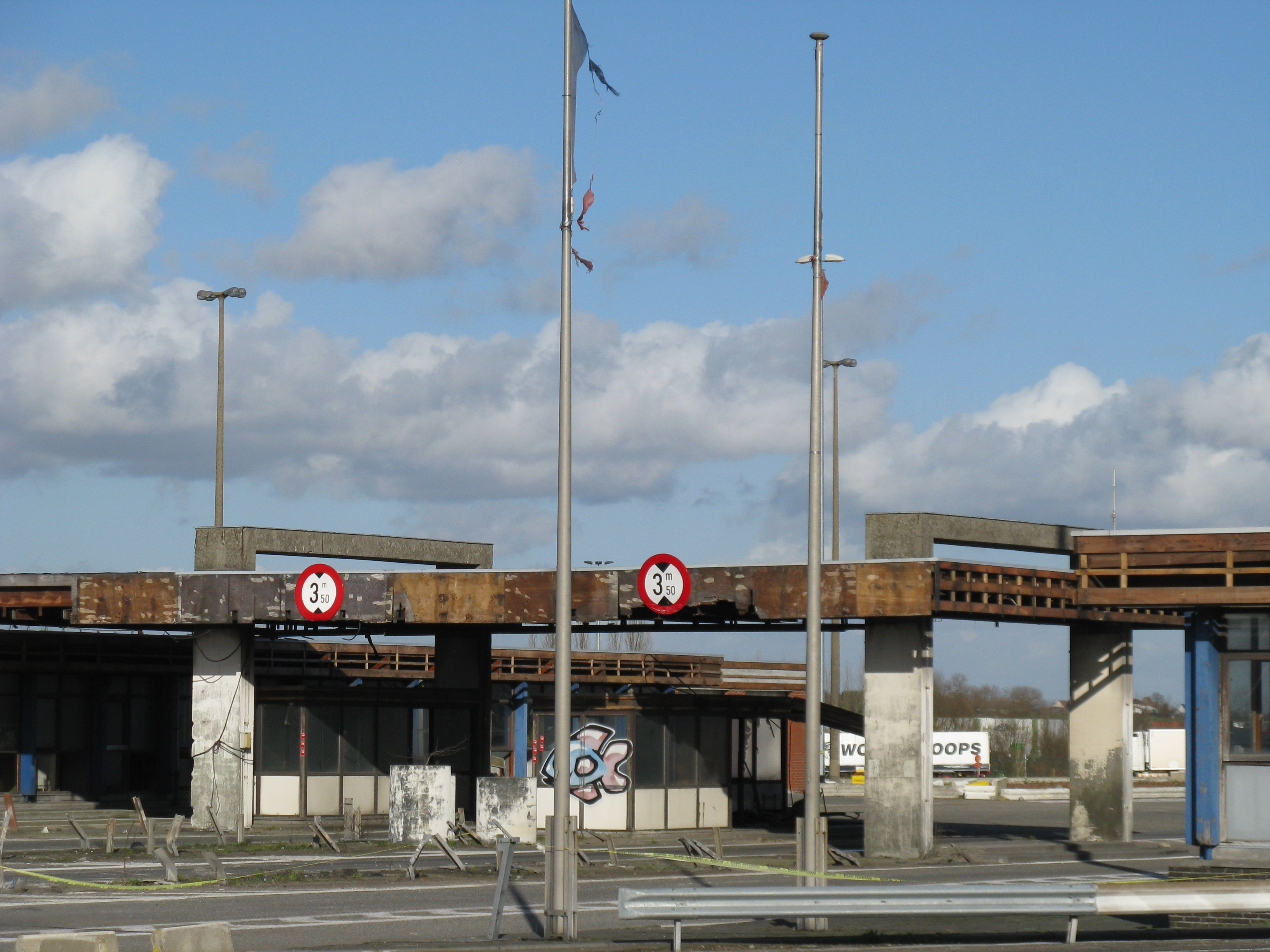 "Following the gradual implementation after 1995 of the Schengen Agreement throughout most of the European Union, systematic border checks and patrols disappeared to allow for the free movement of people between different countries. As a consequence, most border posts were quickly removed. This example is at Rekkem, about 10 miles north of the French city of Lille on the main route from Paris to northern Europe and is located precisely on the France / Belgium border (although technically, the buildings are on Belgian soil). In its day, it was reportedly the largest example of its kind in Europe and had a variety of services for both staff and travellers—including a couple of cells. After lying abandoned for over twenty years, work finally began in February 2014 to destroy it within a month. Spot checks by Customs can still take place however, as on the day the pictures were taken."
