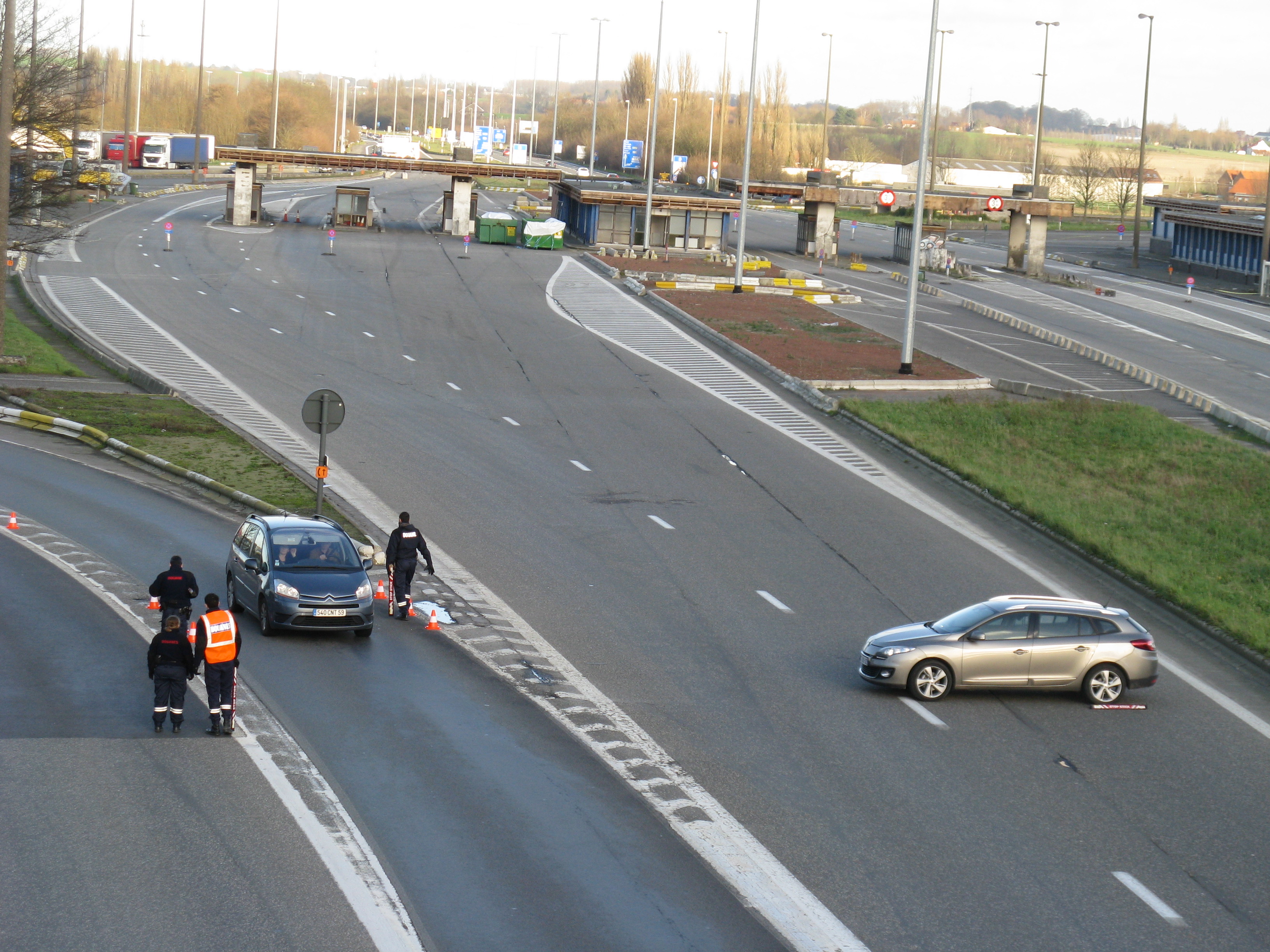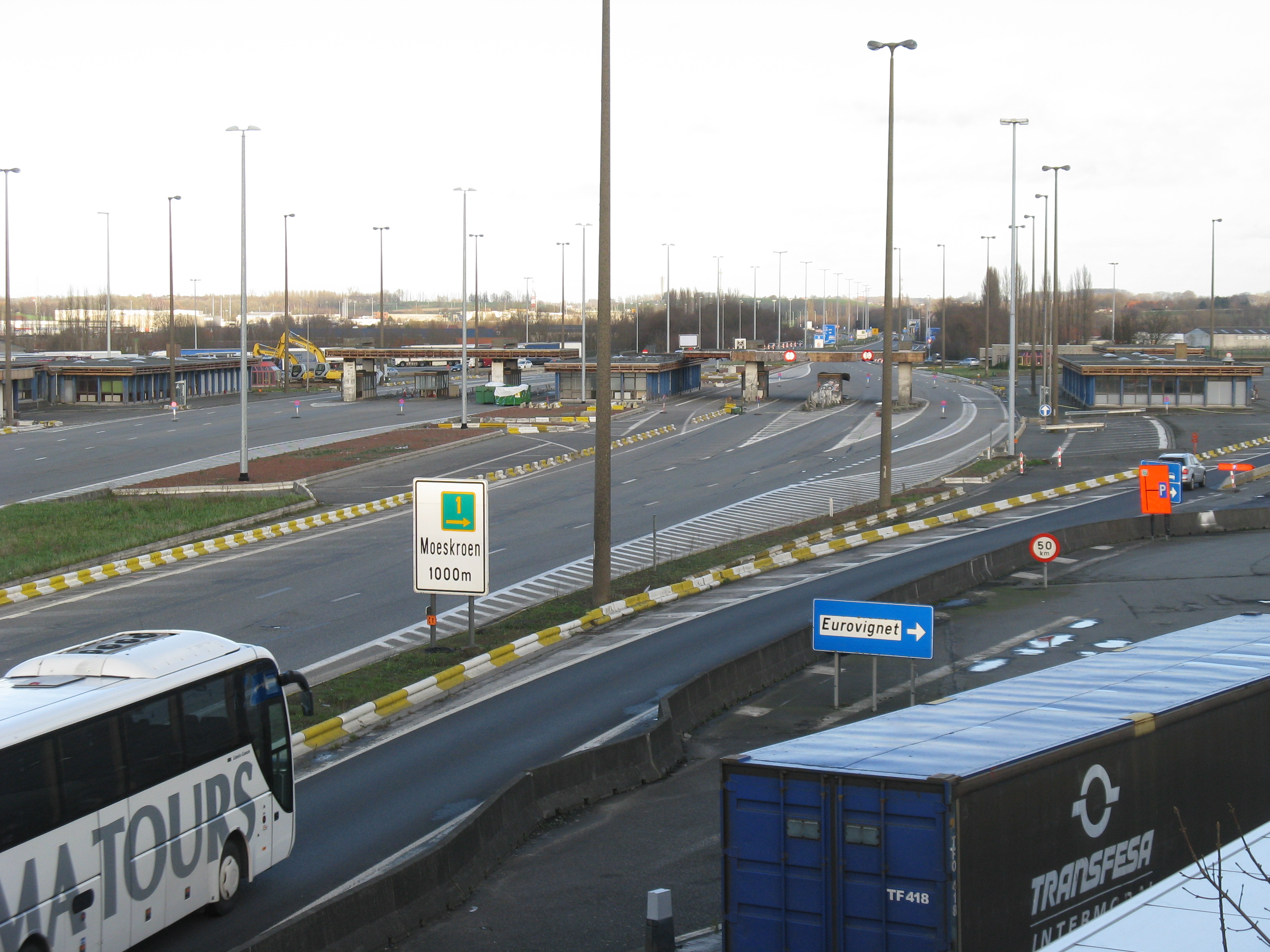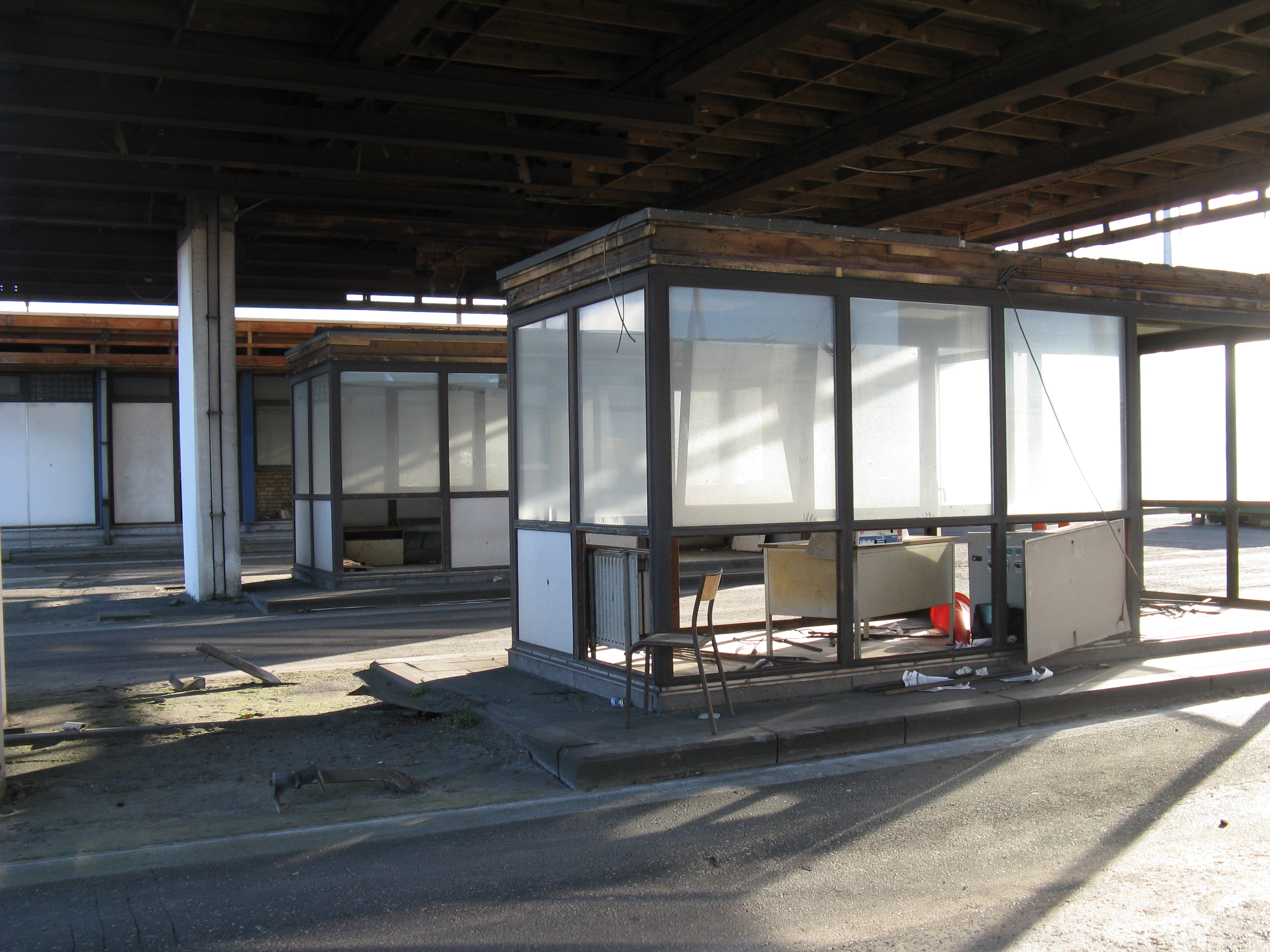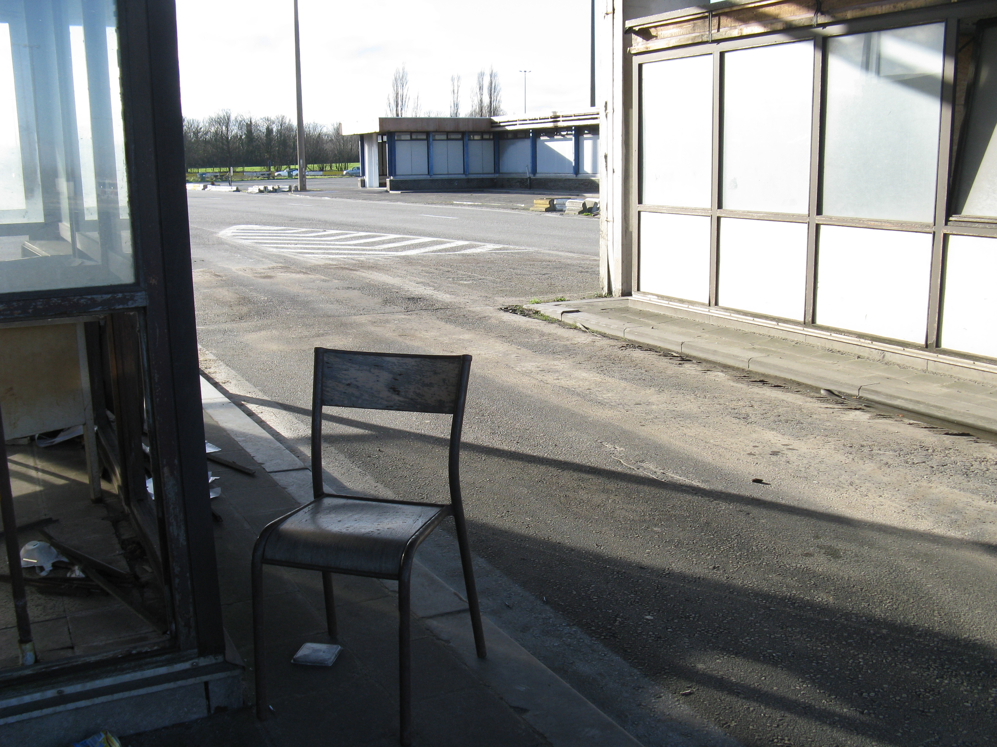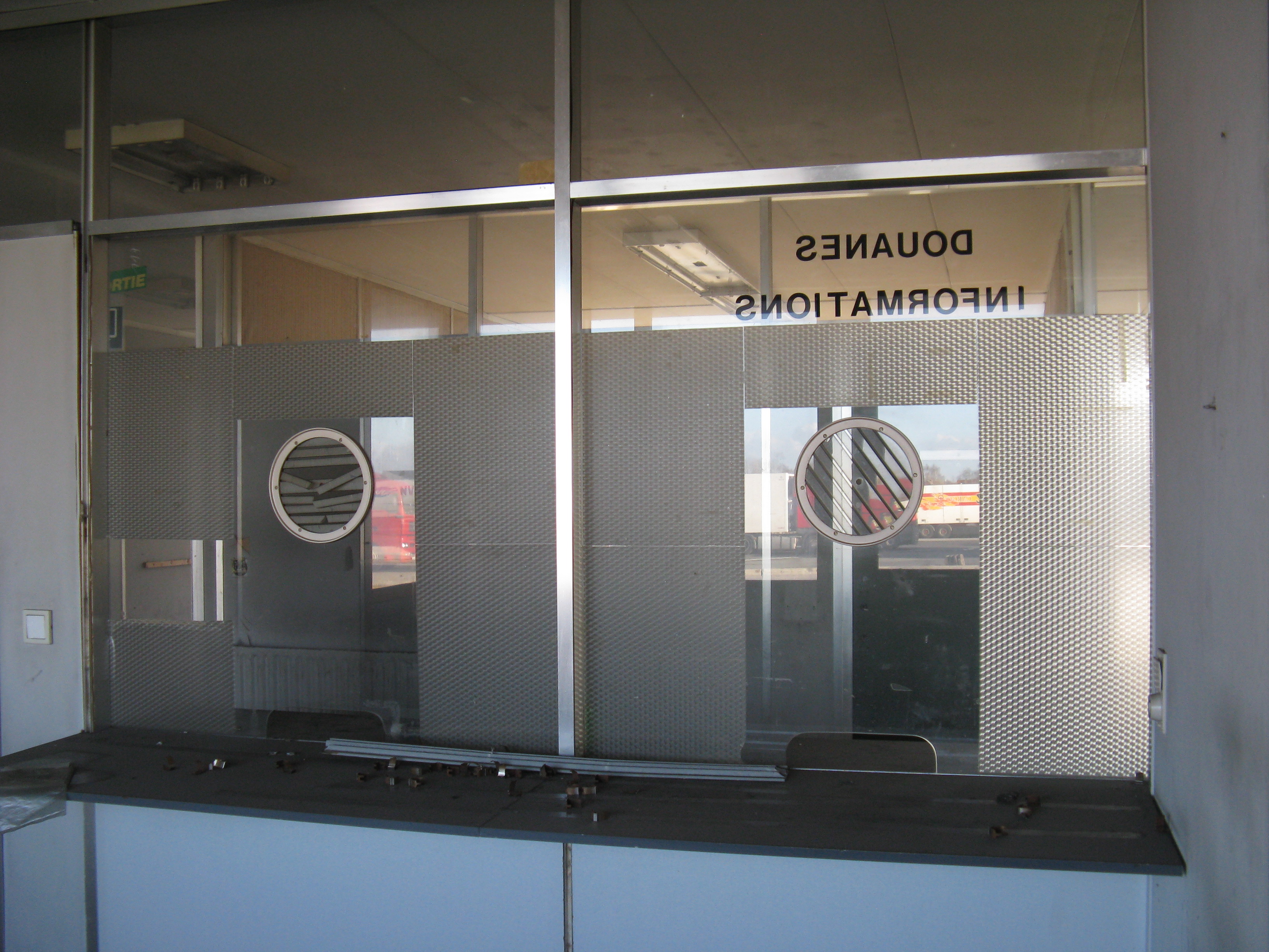 "Following the gradual implementation after 1995 of the Schengen Agreement throughout most of the European Union, systematic border checks and patrols disappeared to allow for the free movement of people between different countries. As a consequence, most border posts were quickly removed. This example is at Rekkem, about 10 miles north of the French city of Lille on the main route from Paris to northern Europe and is located precisely on the France / Belgium border (although technically, the buildings are on Belgian soil). In its day, it was reportedly the largest example of its kind in Europe and had a variety of services for both staff and travellers—including a couple of cells. After lying abandoned for over twenty years, work finally began in February 2014 to destroy it within a month. Spot checks by Customs can still take place however, as on the day the pictures were taken."