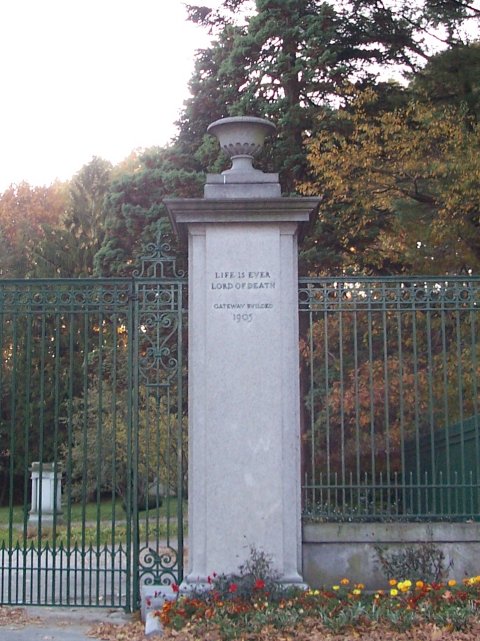 The two entrances to the cemetery. The first is on Lawrence St in South Lowell, and dates to the 1860s. The second is off behind Shedd Park on the edge of Belvidere and dates to 1905. "LIFE IS EVER LORD OF DEATH" ... interesting.